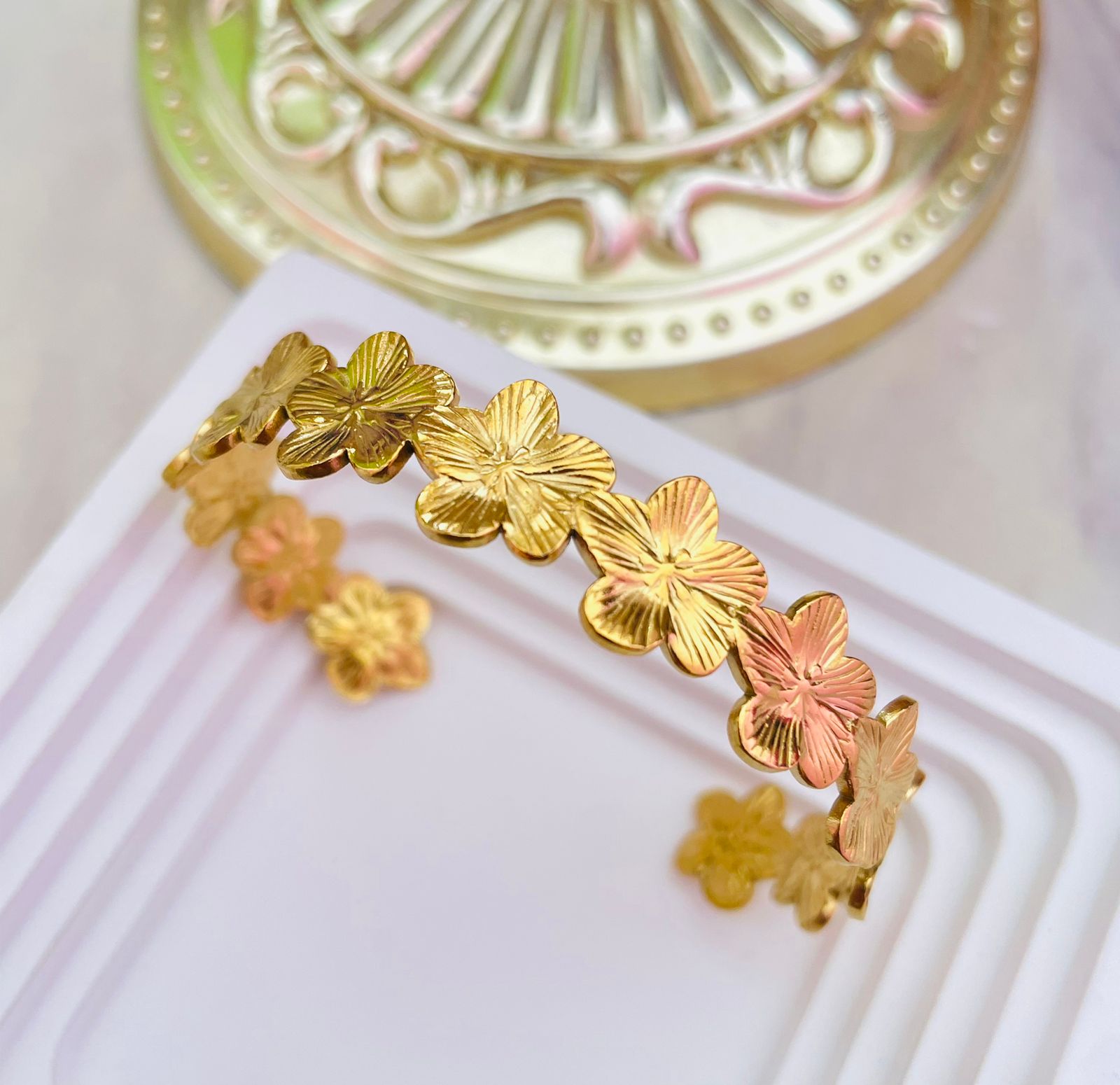 Este delicado brazalete dorado es la combinación perfecta de sutileza y encanto. Elaborado en acero inoxidable con un refinado baño de oro de 18 quilates, ofrece un brillo duradero y una apariencia sofisticada.