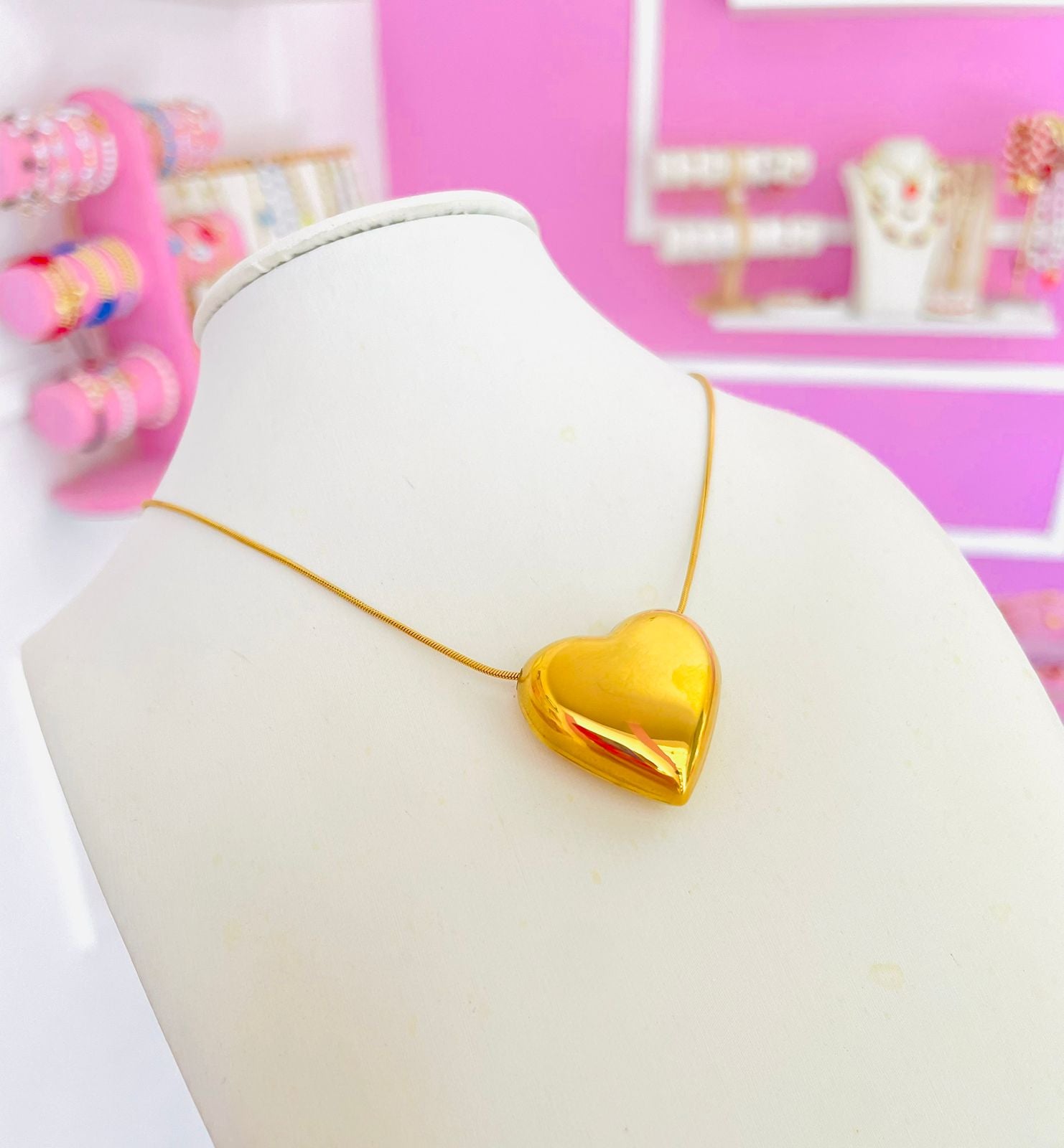Añade un toque audaz y elegante a tu look con esta hermosa cadena elaborada en acero inoxidable de alta calidad, con un lujoso baño de oro de 18 quilates que realza su brillo y durabilidad. Su diseño incluye un llamativo dije de corazón chunky en tono dorado, perfecto para destacar en cualquier ocasión.