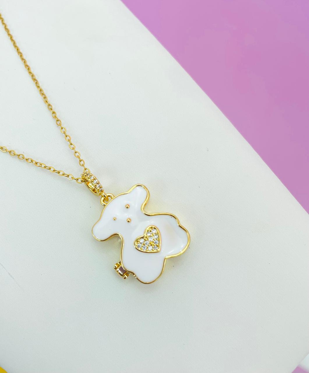 El osito está elaborado en resina blanca de alta calidad, con un acabado suave y delicado. Acompañado de una cadena de acero inoxidable, esta pieza es resistente, hipoalergénica y perfecta para el uso diario.