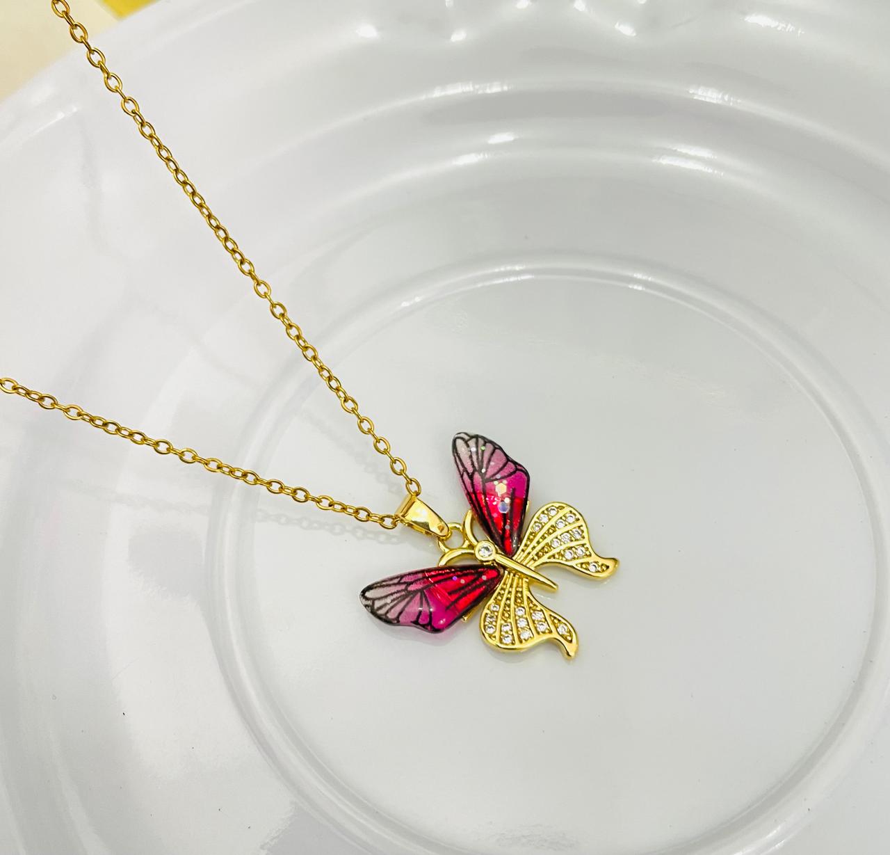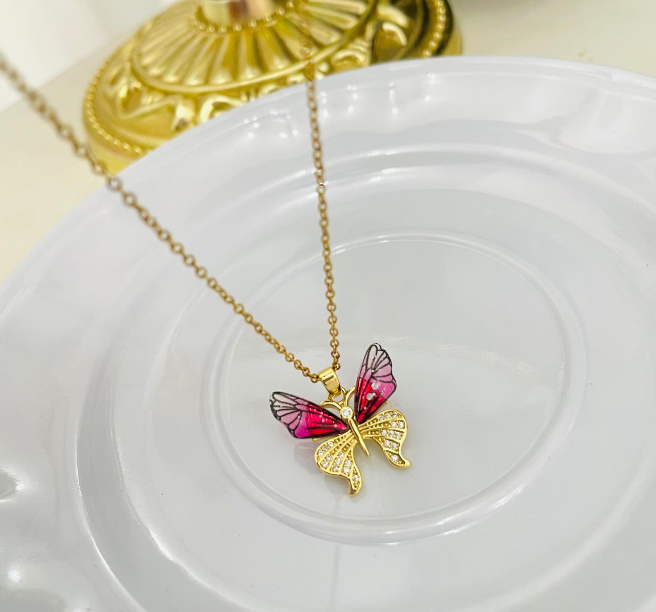 Esta encantadora cadena de acero inoxidable dorado lleva como protagonista un dije de mariposa en color rosa, elaborado en resina de acabado suave y brillante. Su diseño femenino y ligero evoca libertad, renovación y belleza natural.