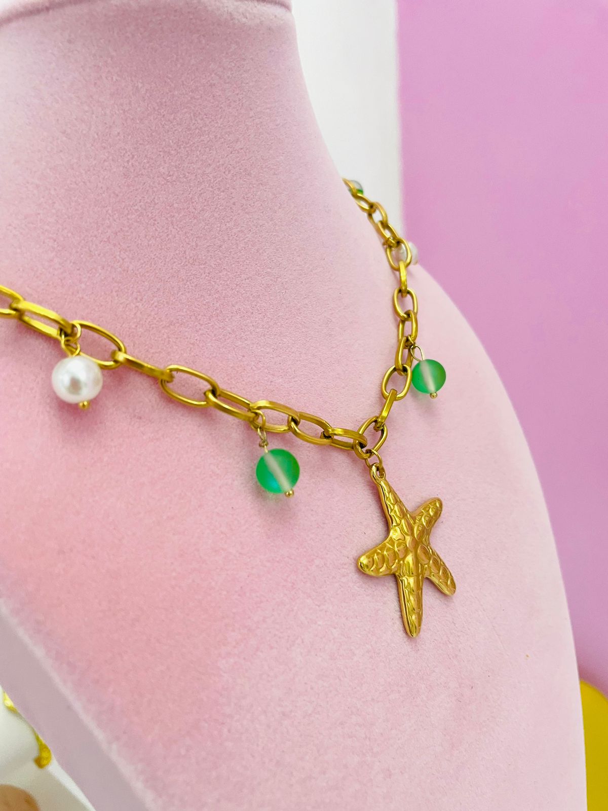 Este encantador collar de acero inoxidable dorado está diseñado para capturar la magia del mar en cada detalle. En el centro, destaca un dije de estrella de mar de gran tamaño, con una textura detallada que imita la belleza natural del océano. A su alrededor, pequeños charms decorativos —perlitas blancas y bolitas de piedra en tono verde tornasolado— aportan un contraste sutil, lleno de luz y frescura.