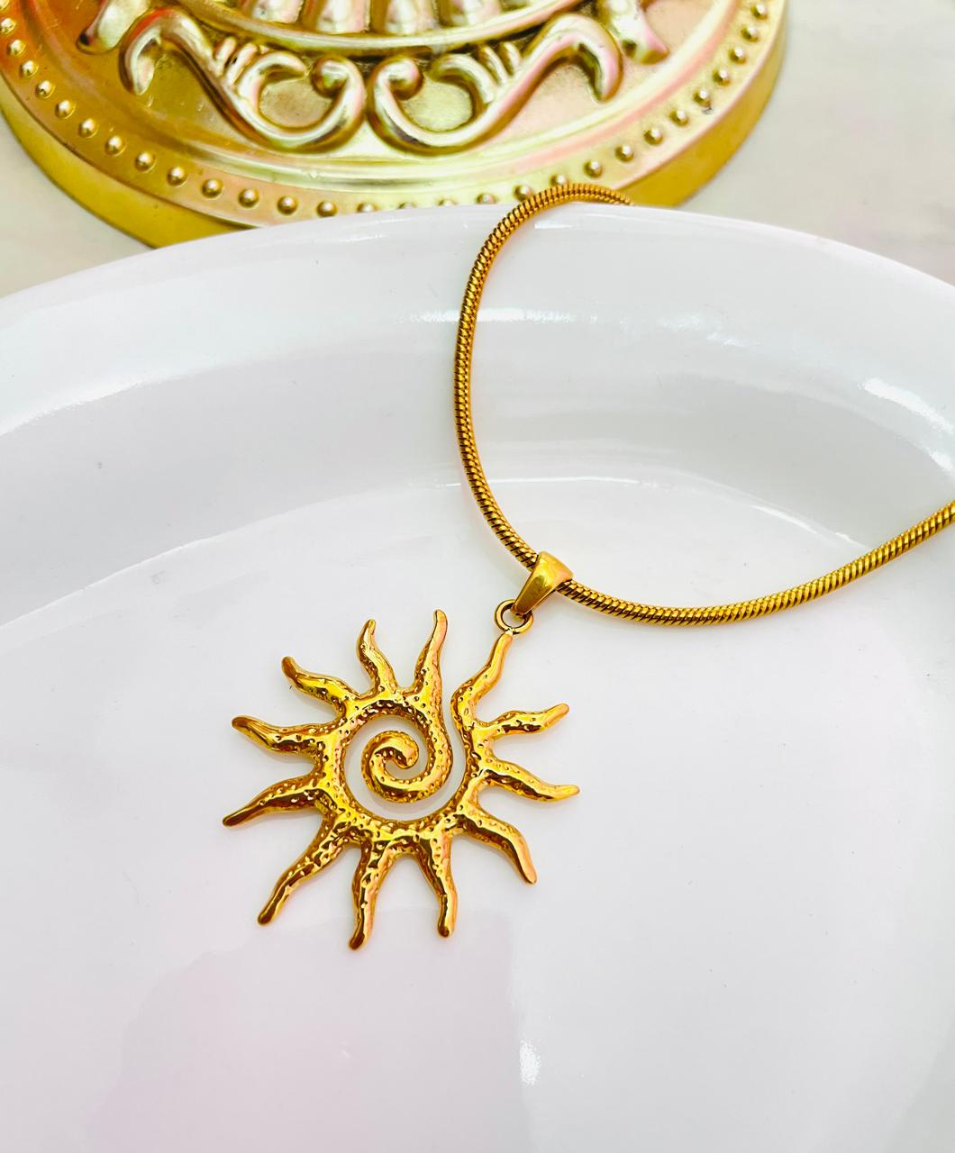 El dije de sol, símbolo de poder, vitalidad y renacimiento, destaca como pieza central, convirtiendo este collar en un accesorio perfecto para elevar cualquier outfit, ya sea casual o elegante.